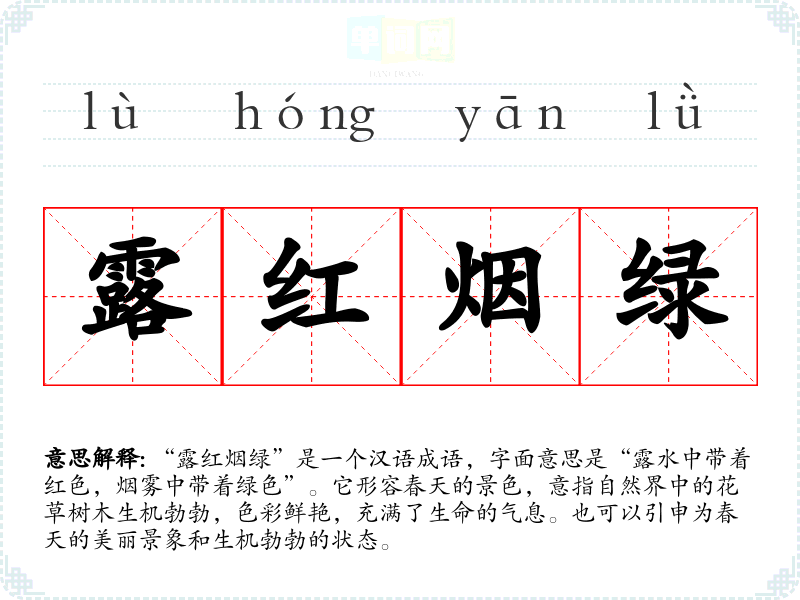 “露红烟绿”是一个汉语成语,字面意思是“露水中带着红色,烟雾中带着绿色”。它形容春天的景色,意指自然界中的花草树木生机勃勃,色彩鲜艳,充满了生命的气息。也可以引申为春天的美丽景象和生机勃勃的状态。