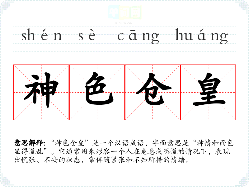 “神色仓皇”是一个汉语成语,字面意思是“神情和面色显得慌乱”。它通常用来形容一个人在危急或恐慌的情况下,表现出慌张、不安的状态,常伴随紧张和不知所措的情绪。