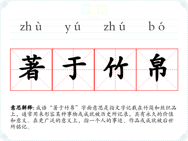 成语“著于竹帛”字面意思是指文字记载在竹简和丝织品上,通常用来形容某种事物或成就被历史所记录,具有永久的价值和意义。在更广泛的意义上,指一个人的事迹、作品或成就被后世所铭记。