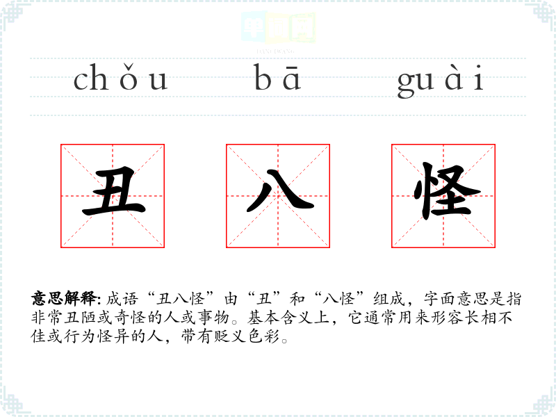 成语“丑八怪”由“丑”和“八怪”组成,字面意思是指非常丑陋或奇怪的人或事物。基本含义上,它通常用来形容长相不佳或行为怪异的人,带有贬义色彩。