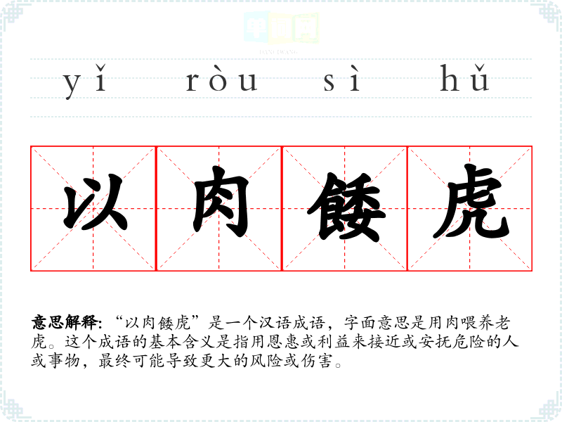 “以肉餧虎”是一个汉语成语,字面意思是用肉喂养**。这个成语的基本含义是指用恩惠或利益来接近或安抚危险的人或事物,最终可能导致更大的风险或伤害。
