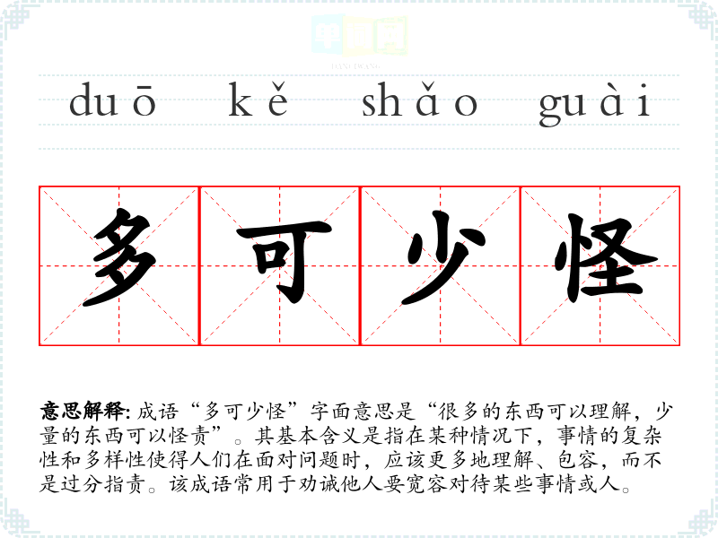 成语“多可少怪”字面意思是“很多的东西可以理解,少量的东西可以怪责”。其基本含义是指在某种情况下,事情的复杂性和多样性使得人们在面对问题时,应该更多地理解、包容,而不是过分指责。该成语常用于劝诫他人要宽容对待某些事情或人。