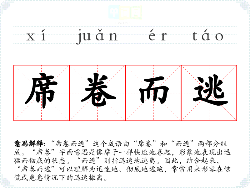 “席卷而逃”这个成语由“席卷”和“而逃”两部分组成。“席卷”字面意思是像席子一样快速地卷起,形象地表现出迅猛而彻底的状态。“而逃”则指迅速地逃离。因此,结合起来,“席卷而逃”可以理解为迅速地、彻底地逃跑,常常用来形容在惊慌或危急情况下的迅速撤离。