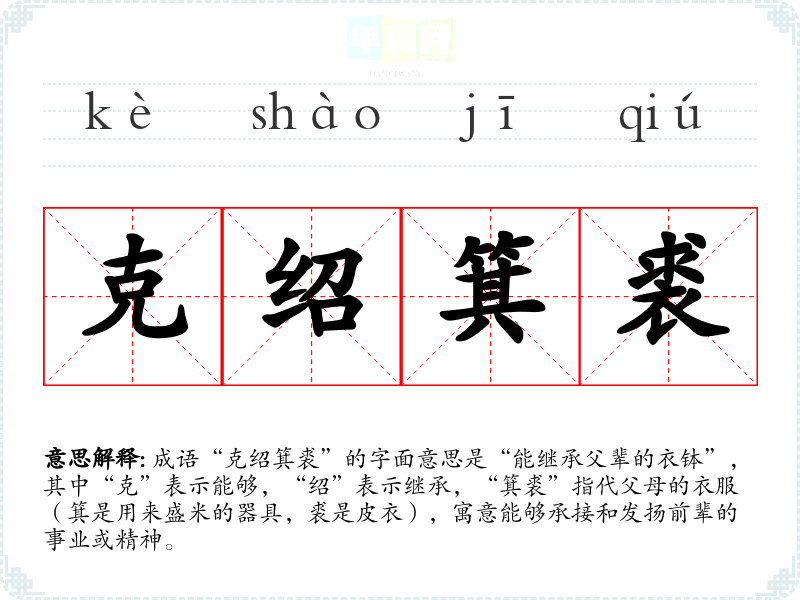 成语“克绍箕裘”的字面意思是“能继承父辈的衣钵”,其中“克”表示能够,“绍”表示继承,“箕裘”指代父母的衣服(箕是用来盛米的器具,裘是皮衣),寓意能够承接和发扬前辈的事业或精神。