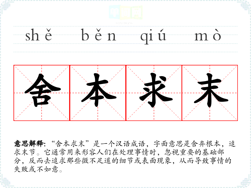 “舍本求末”是一个汉语成语,字面意思是舍弃根本,追求末节。它通常用来形容人们在处理事情时,忽视重要的基础部分,反而去追求那些微不足道的细节或表面现象,从而导致事情的失败或不如意。