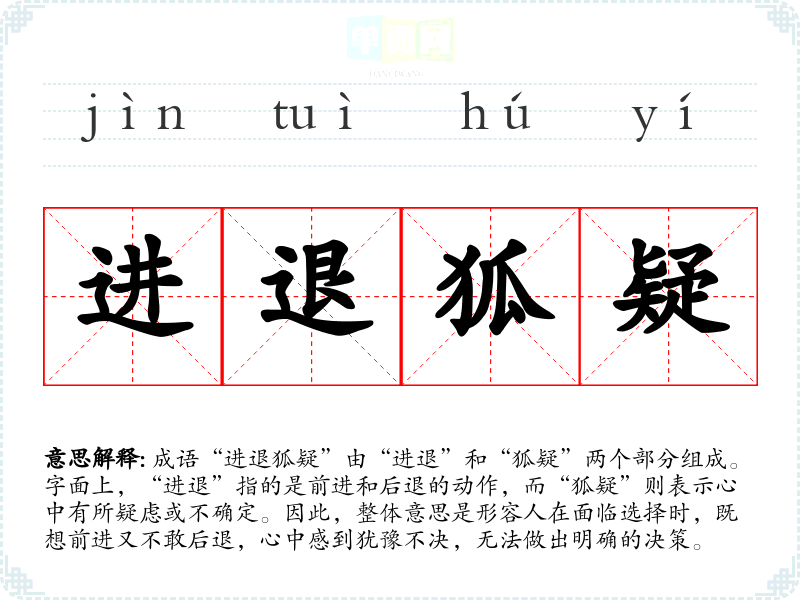 成语“进退狐疑”由“进退”和“狐疑”两个部分组成。字面上,“进退”指的是前进和后退的动作,而“狐疑”则表示心中有所疑虑或不确定。因此,整体意思是形容人在面临选择时,既想前进又不敢后退,心中感到犹豫不决,无法做出明确的决策。
