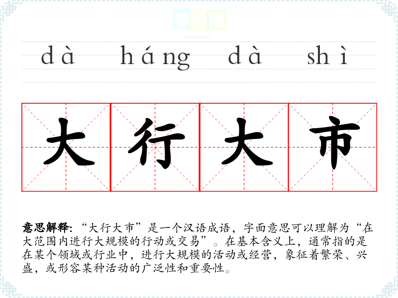 “大行大市”是一个汉语成语,字面意思可以理解为“在大范围内进行的行动或交易”。在基本含义上,通常指的是在某个领域或行业中,进行的活动或经营,象征着繁荣、兴盛,或形容某种活动的广泛性和重要性。