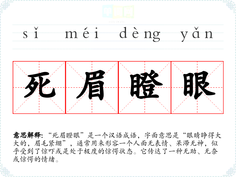 “死眉瞪眼”是一个汉语成语,字面意思是“眼睛睁得大大的,眉毛紧绷”,通常用来形容一个人面无表情、呆滞无神,似乎受到了惊吓或是处于极度的惊愕状态。它传达了一种无助、无奈或惊愕的情绪。