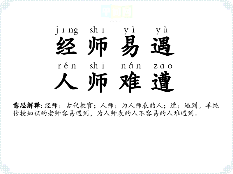 | 经师易遇,人师难遭 | 经师:古代教官;人师:为人师表的人;遭:遇到。单纯传授知识的老师容易遇到,为人师表的人不容易的人难遇到。 |