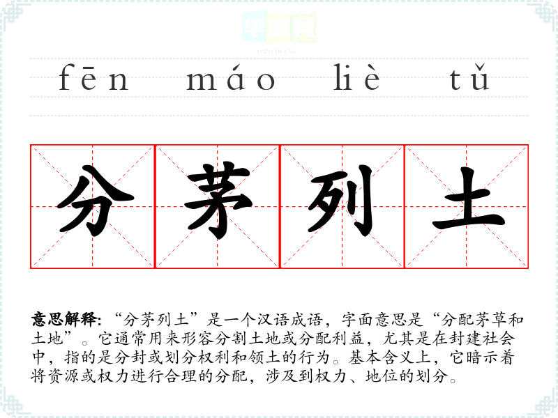 “分茅列土”是一个汉语成语,字面意思是“分配茅草和土地”。它通常用来形容分割土地或分配利益,尤其是在封建社会中,指的是分封或划分权利和领土的行为。基本含义上,它暗示着将资源或权力进行合理的分配,涉及到权力、地位的划分。