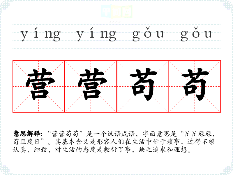 “营营苟苟”是一个汉语成语,字面意思是“忙忙碌碌,苟且度日”。其基本含义是形容人们在生活中忙于琐事,过得不够认真、细致,对生活的态度是敷衍了事,缺乏追求和理想。