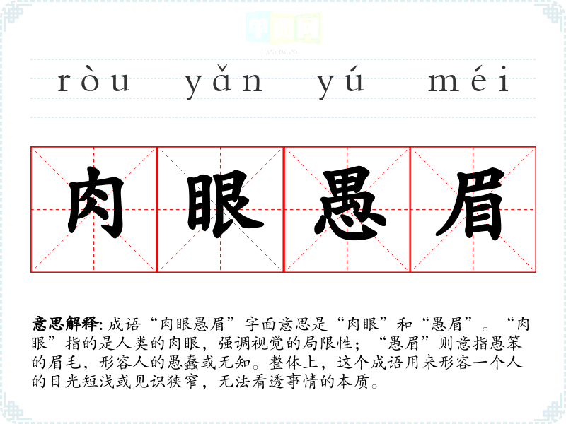 肉眼凡胎 肉眼:佛经中说有,天、肉慧、法佛五眼,肉眼为肉身之眼,也泛指俗眼;凡胎:指凡人的身体。指尘世平常的人。