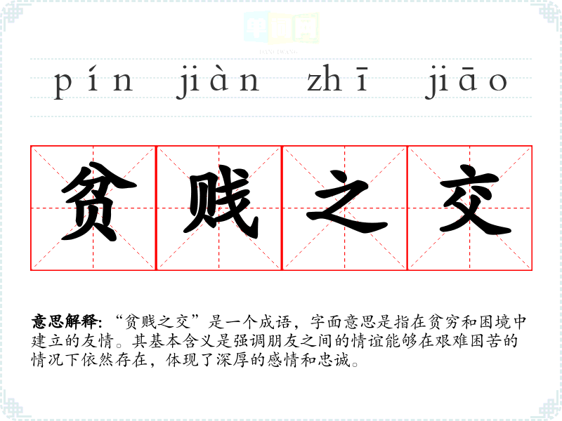 “贫贱之交”是一个成语,字面意思是指在贫穷和困境中建立的友情。其基本含义是强调朋友之间的情谊能够在艰难困苦的情况下依然存在,体现了深厚的感情和忠诚。