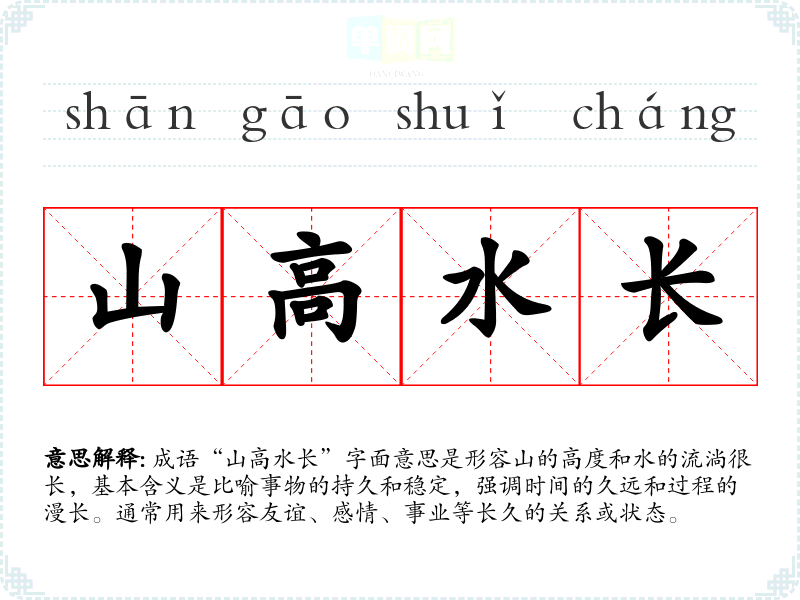 成语“山高水长”字面意思是形容山的高度和水的流淌很长,基本含义是比喻事物的持久和稳定,强调时间的久远和过程的漫长。通常用来形容友谊、感情、事业等长久的关系或状态。