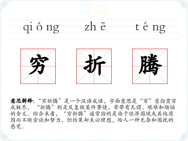 “穷折腾”并没有明确的历史文献记载,属于现代汉语的通俗用语,常常用于口语交流中。它的形成与社会经济变迁、生活压力增大等因素密切相关,反映了人们在困境中不断尝试和奋斗的精神。