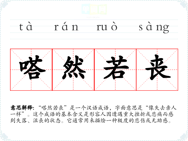 “嗒然若丧”是一个汉语成语,字面意思是“像失去亲人一样”。这个成语的基本含义是形容人因遭遇重大挫折或悲痛而感到失落、沮丧的状态。它通常用来描绘一种极度的悲伤或无助感。