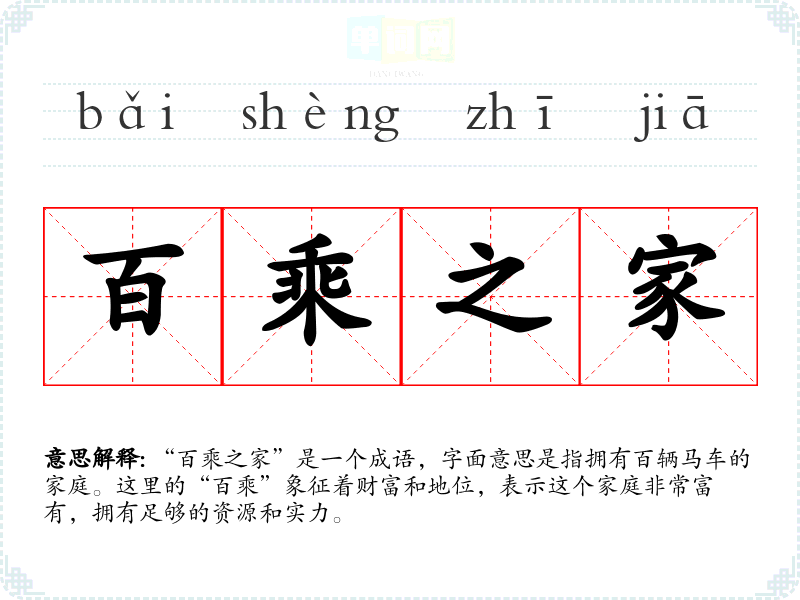 “百乘之家”是一个成语,字面意思是指拥有百辆马车的家庭。这里的“百乘”象征着财富和地位,表示这个家庭非常富有,拥有足够的资源和实力。