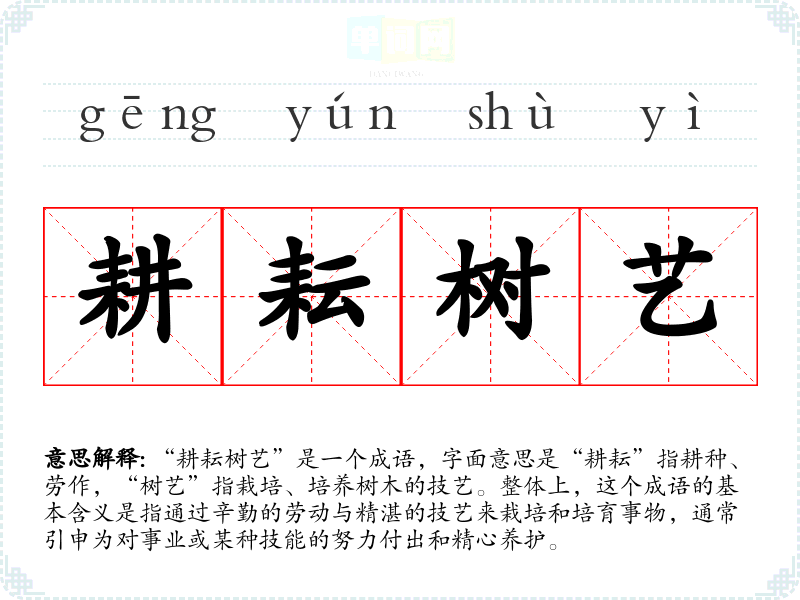 “耕耘树艺”是一个成语,字面意思是“耕耘”指耕种、劳作,“树艺”指栽培、培养树木的技艺。整体上,这个成语的基本含义是指通过辛勤的劳动与精湛的技艺来栽培和培育事物,通常引申为对事业或某种技能的努力付出和精心养护。