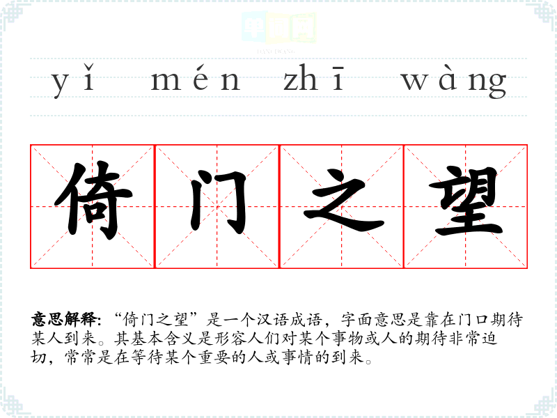 “倚门之望”是一个汉语成语,字面意思是靠在门口期待某人到来。其基本含义是形容人们对某个事物或人的期待非常迫切,常常是在等待某个重要的人或事情的到来。