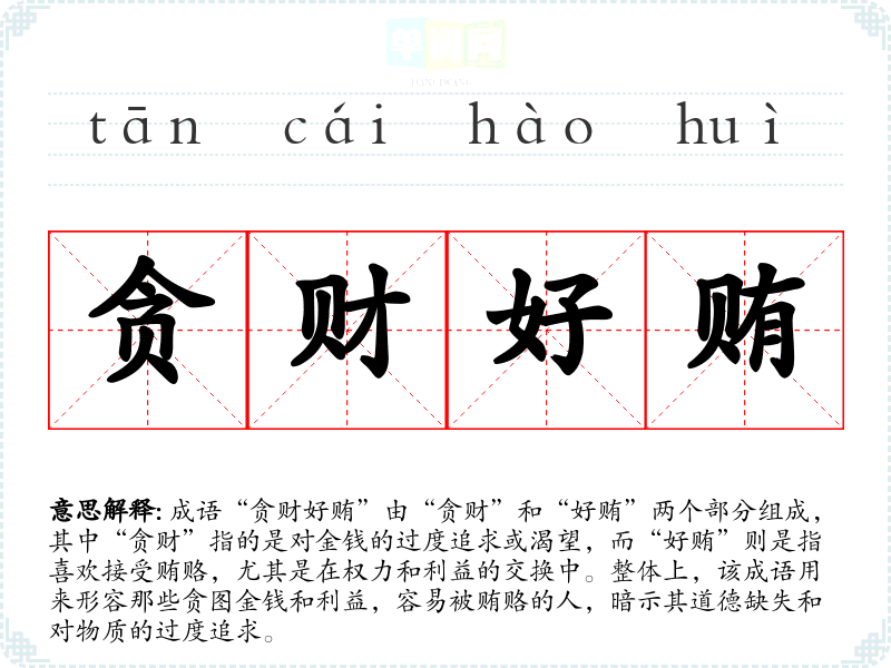 成语“贪财好贿”由“贪财”和“好贿”两个部分组成,其中“贪财”指的是对金钱的过度追求或渴望,而“好贿”则是指喜欢接受贿赂,尤其是在权力和利益的交换中。整体上,该成语用来形容那些贪图金钱和利益,容易被贿赂的人,暗示其道德缺失和对物质的过度追求。