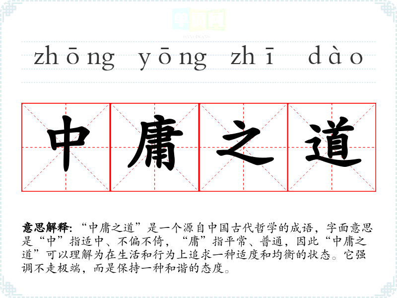 “中庸之道”是一个源自**古代哲学的成语,字面意思是“中”指适中、不偏不倚,“庸”指平常、普通,因此“中庸之道”可以理解为在生活和行为上追求一种适度和均衡的状态。它强调不走极端,而是保持一种和谐的态度。