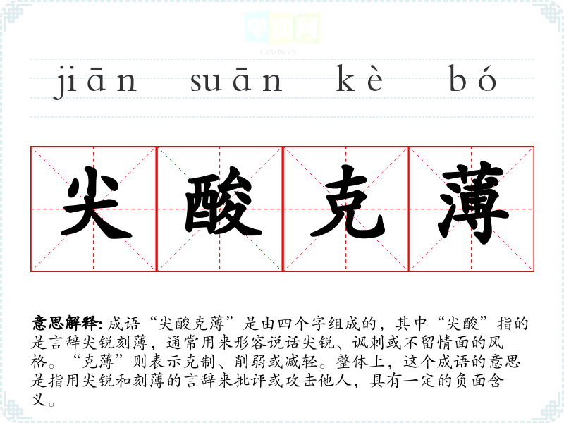 成语“尖酸克”是由四个字组成的,其中“尖酸”指的是言辞尖锐刻,通常用来形容说话尖锐、讽刺或不留情面的风格。“克”则表示克制、削弱或减轻。整体上,这个成语的意思是指用尖锐和刻的言辞来批评或攻击他人,具有一定的负面含义。