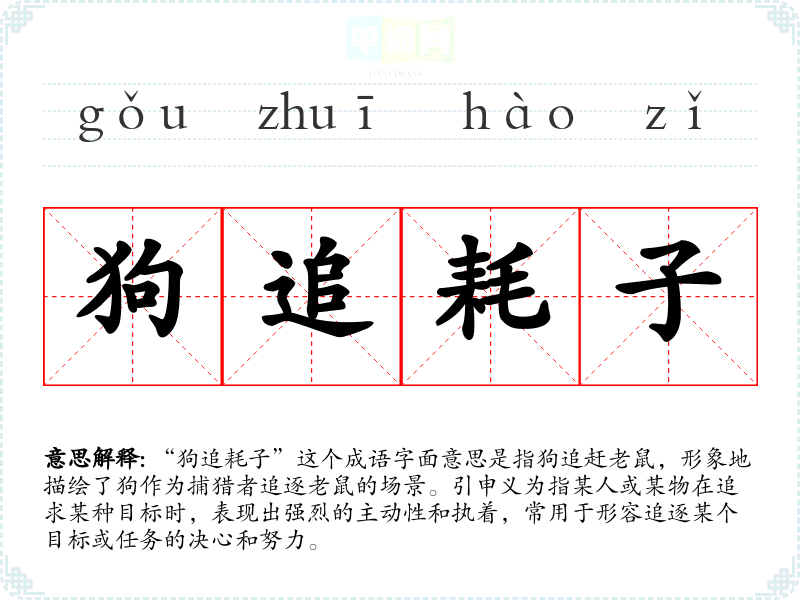 “狗追耗子”这个成语字面意思是指狗追赶老鼠,形象地描绘了狗作为捕猎者追逐老鼠的场景。引申义为指某人或某物在追求某种目标时,表现出强烈的主动性和执着,常用于形容追逐某个目标或任务的决心和努力。