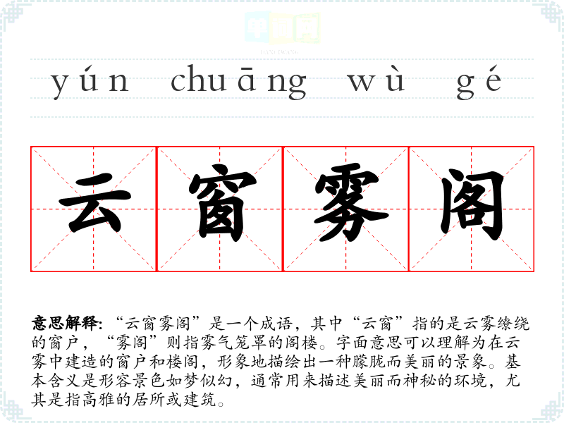 “云窗雾阁”是一个成语,其中“云窗”指的是云雾缭绕的窗户,“雾阁”则指雾气笼罩的阁楼。字面意思可以理解为在云雾中建造的窗户和楼阁,形象地描绘出一种朦胧而美丽的景象。基本含义是形容景色如梦似幻,通常用来描述美丽而神秘的环境,尤其是指高雅的居所或建筑。
