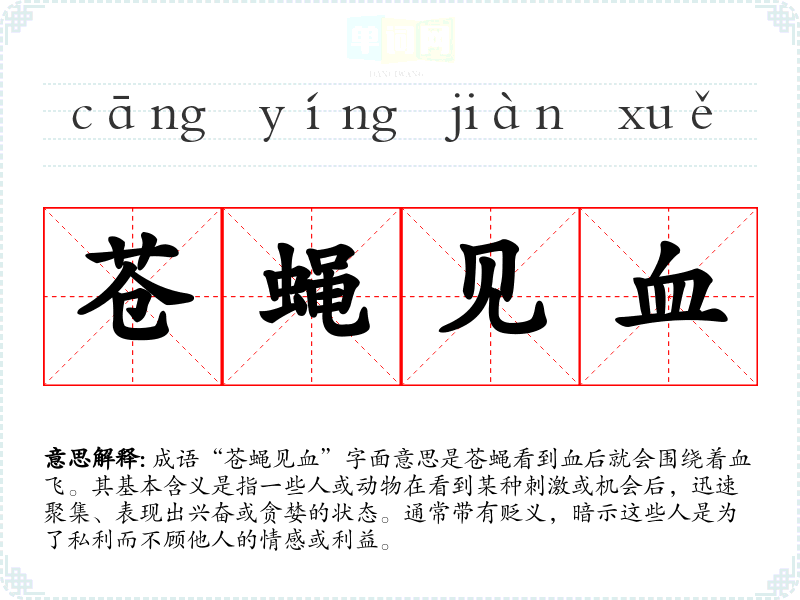 - 反义成语:如“见义勇为”指的是在他人需要帮助时勇敢出手,与“苍蝇见血”形成鲜明对比。