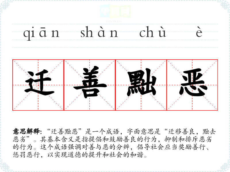 - “扬善抑恶”:意指提倡善良,抑制恶行。与“迁善黜恶”相似,但更侧重于对善的提升。