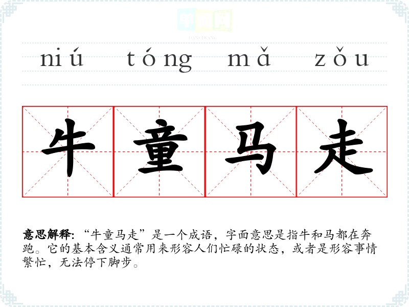 “牛童马走”是一个成语,字面意思是指牛和马都在奔跑。它的基本含义通常用来形容人们忙碌的状态,或者是形容事情繁忙,无法停下脚步。