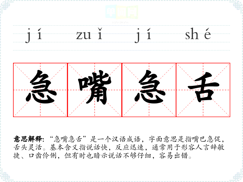 “急嘴急舌”是一个汉语成语,字面意思是指嘴巴急促,舌头灵活。基本含义指说话快,反应迅速,通常用于形容人言辞敏捷、口齿伶俐,但有时也暗示说话不够仔细,容易出错。