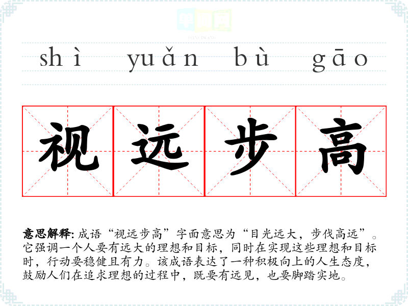 成语“视远步高”字面意思为“目光远大,步伐高远”。它强调一个人要有远大的理想和目标,同时在实现这些理想和目标时,行动要稳健且有力。该成语表达了一种积极向上的人生态度,鼓励人们在追求理想的过程中,既要有远见,也要脚踏实地。