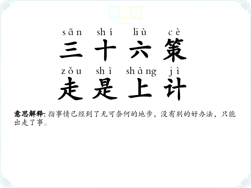 | 三十六策,走是上计 | 指事情已经到了无可奈何的地步,没有别的好办法,只能出走了事。 |
