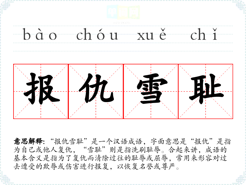 “报仇雪耻”是一个汉语成语,字面意思是“报仇”是指为自己或他人复仇,“雪耻”则是指洗刷耻辱。合起来讲,成语的基本含义是指为了复仇而清除过往的耻辱或屈辱,常用来形容对过去遭受的欺辱或伤害进行报复,以恢复名誉或尊严。