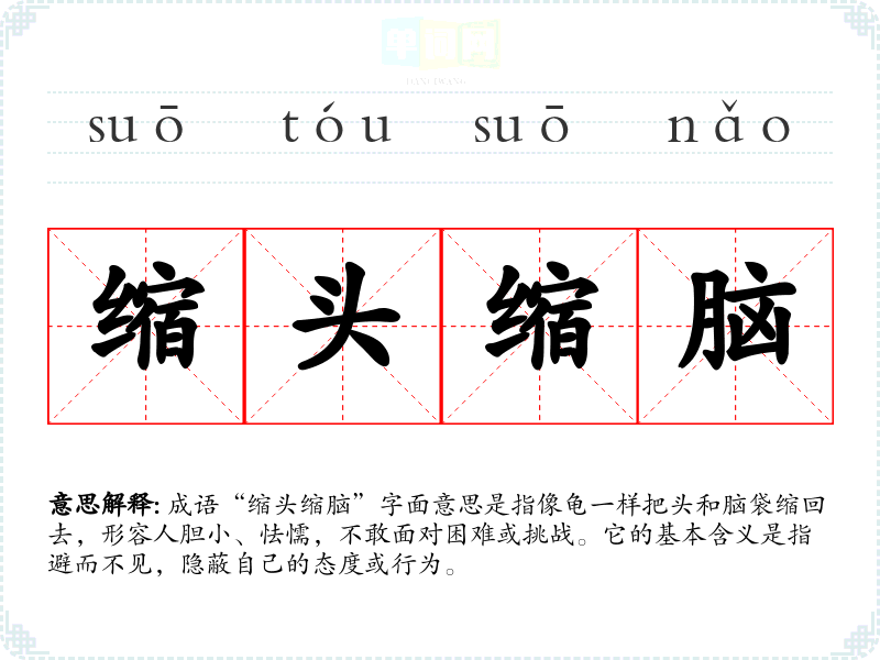 “缩头缩脑”这个成语的历史背景较为悠久,最早可以追溯到古代人们对动物的观察,尤其是对乌龟的行为。乌龟在受到威胁时会将头和四肢缩进壳里,这种行为成为了形容人们在面临压力或危险时躲避的象征。虽然没有明确的文学出处,但其隐含的意义在**文化中广泛存在。