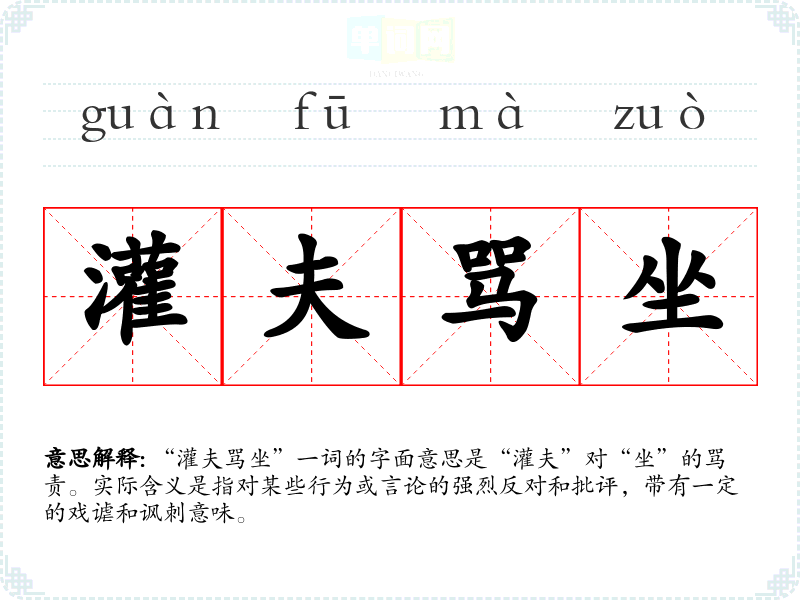 “灌夫骂坐”一词的字面意思是“灌夫”对“坐”的骂责。实际含义是指对某些行为或言论的强烈反对和批评,带有一定的戏谑和讽刺意味。