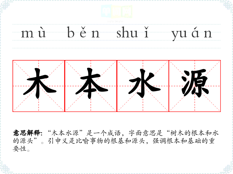 “木本水源”是一个成语,字面意思是“树木的根本和水的源头”。引申义是比喻事物的根基和源头,强调根本和基础的重要性。