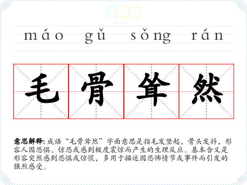 成语“毛骨耸然”字面意思是指毛发竖起,骨头发抖,形容人因恐惧、惊恐或感到极度震惊而产生的生理反应。基本含义是形容突然感到恐惧或惊慌,多用于描述因恐怖情节或**而引发的强烈感受。