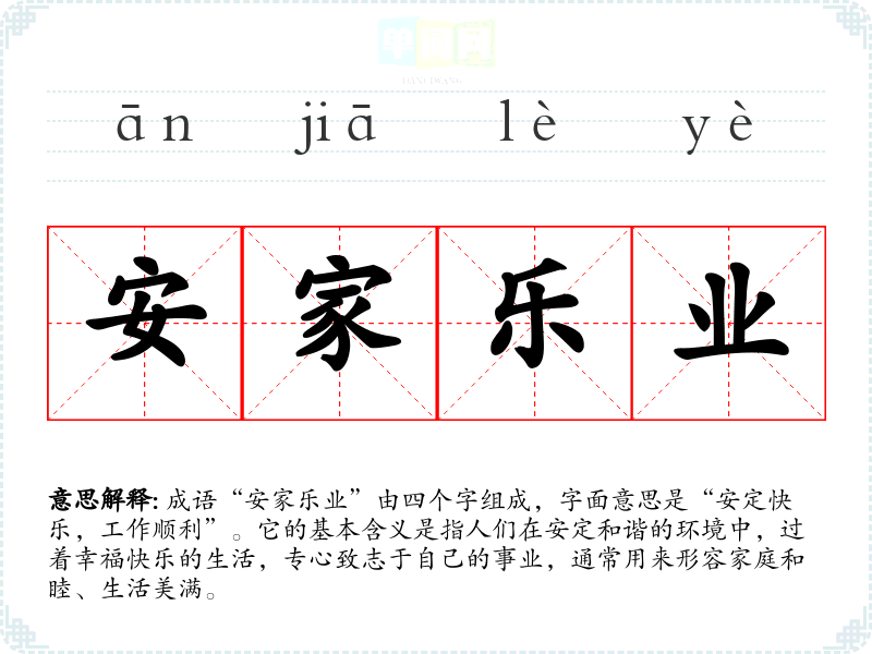 成语“安家乐业”由四个字组成,字面意思是“安定快乐,工作顺利”。它的基本含义是指人们在安定和谐的环境中,过着幸福快乐的生活,专心致志于自己的事业,通常用来形容家庭和睦、生活美满。