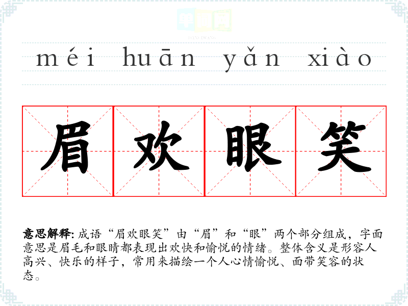 成语“眉欢眼笑”由“眉”和“眼”两个部分组成,字面意思是眉毛和眼睛都表现出欢快和愉悦的情绪。整体含义是形容人高兴、快乐的样子,常用来描绘一个人心情愉悦、面带笑容的状态。