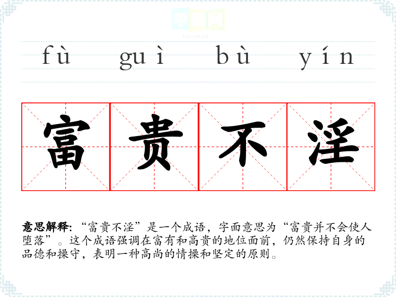 “富贵不淫”是一个成语,字面意思为“富贵并不会使人堕落”。这个成语强调在富有和高贵的地位面前,仍然保持自身的品德和操守,表明一种高尚的情操和坚定的原则。