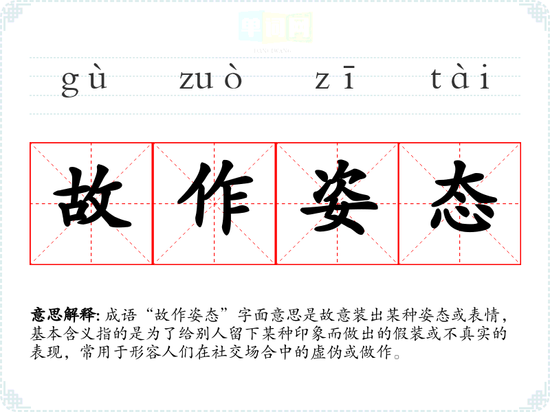 成语“故作姿态”字面意思是故意装出某种姿态或表情,基本含义指的是为了给别人留下某种印象而做出的假装或不真实的表现,常用于形容人们在社交场合中的虚伪或做作。