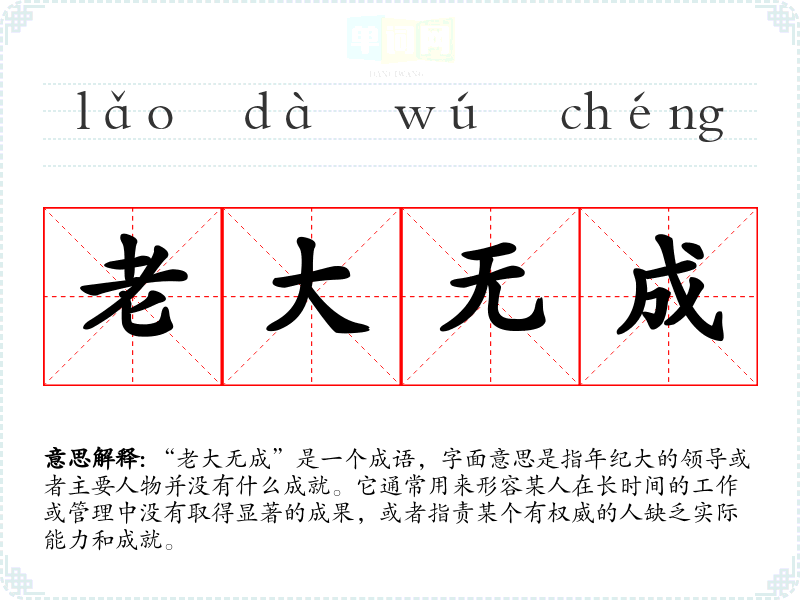 “老大无成”是一个成语,字面意思是指年纪大的领导或者主要人物并没有什么成就。它通常用来形容某人在长时间的工作或管理中没有取得显著的成果,或者指责某个有权威的人缺乏实际能力和成就。