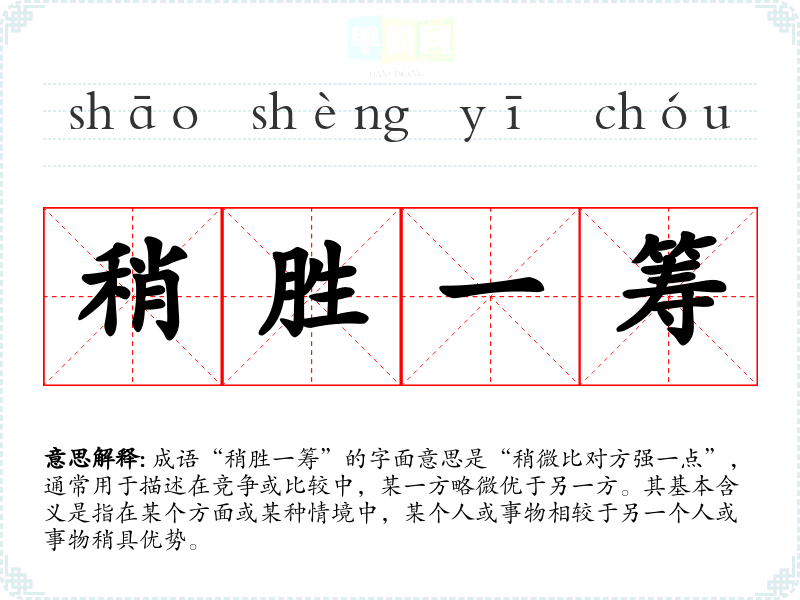 成语“稍胜一筹”的字面意思是“稍微比对方强一点”,通常用于描述在竞争或比较中,某一方略微优于另一方。其基本含义是指在某个方面或某种情境中,某个人或事物相较于另一个人或事物稍具优势。