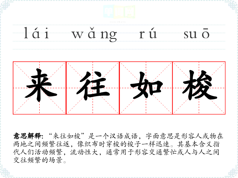 “来往如梭”是一个汉语成语,字面意思是形容人或物在两地之间频繁往返,像织布时穿梭的梭子一样迅速。其基本含义指代人们活动频繁,流动性大,通常用于形容交通繁忙或人与人之间交往频繁的场景。