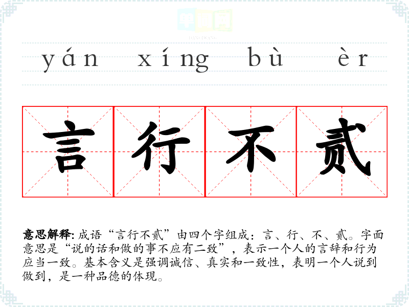 成语“言行不贰”由四个字组成:言、行、不、贰。字面意思是“说的话和做的事不应有二致”,表示一个人的言辞和行为应当一致。基本含义是强调诚信、真实和一致性,表明一个人说到做到,是一种品德的体现。
