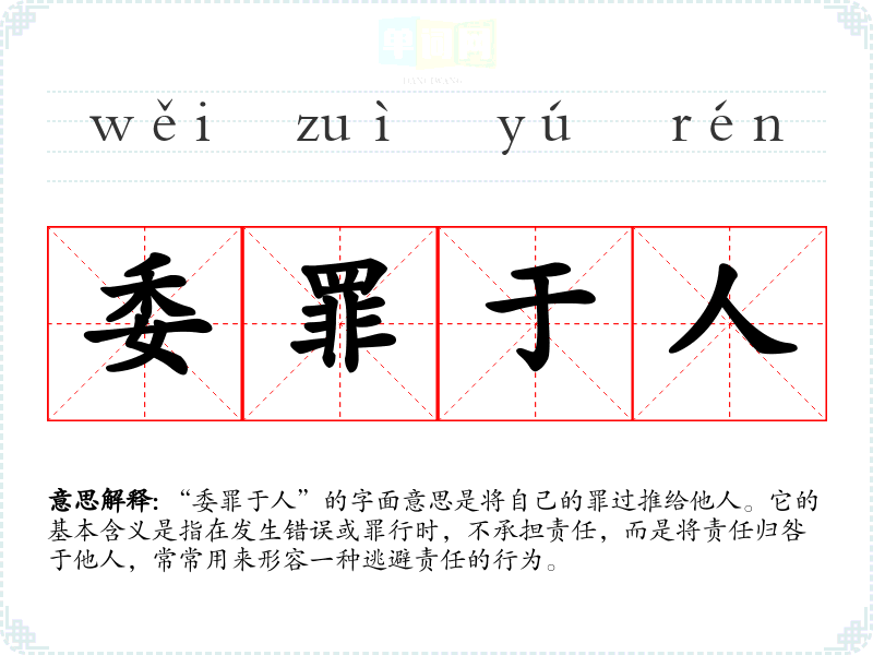 “委罪于人”的字面意思是将自己的罪过推给他人。它的基本含义是指在发生错误或罪行时,不承担责任,而是将责任归咎于他人,常常用来形容一种逃避责任的行为。