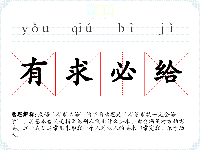 成语“有求必给”的字面意思是“有请求就一定会给予”,其基本含义是指无论别人提出什么要求,都会满足对方的需要。这一成语通常用来形容一个人对他人的要求非常宽容,乐于助人。