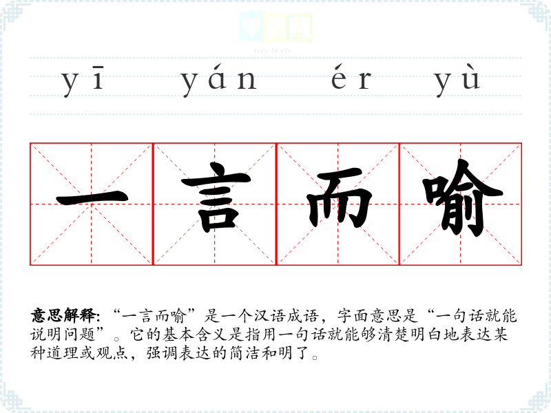 “一言而喻”是一个汉语成语,字面意思是“一句话就能说明问题”。它的基本含义是指用一句话就能够清楚明白地表达某种道理或观点,强调表达的简洁和明了。